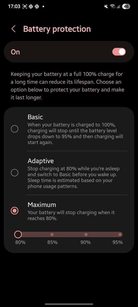 As opções de saúde da bateria oferecem a flexibilidade de escolher como você deseja carregar seu telefone e quando deseja parar. Como não carrego meu telefone em um determinado momento, escolhi a opção que impede o carregamento após a bateria atingir 80%.