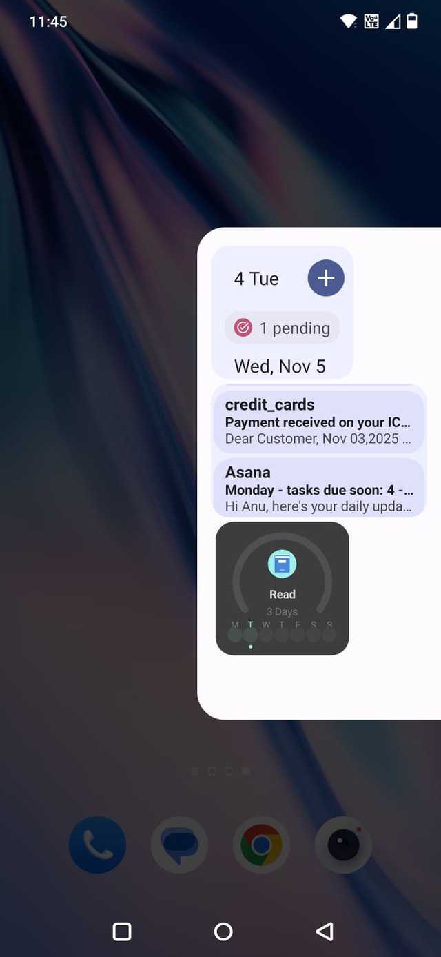 Eu fixei o Agenda do calendário widget para dar uma olhada no meu dia, o Gmail widget para verificar minhas mensagens e o TickTick Rastreador da Semana do Hábito para ver meu progresso sem abrir o aplicativo.