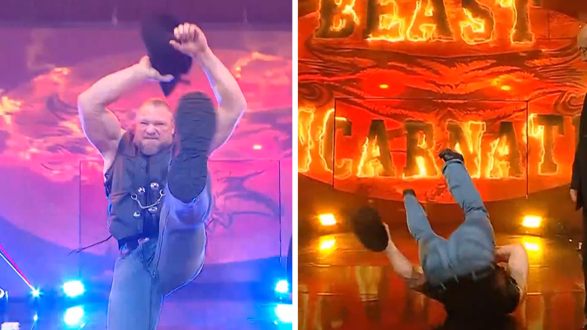 Enquanto Brock tentava sincronizar seu grito com os fogos de artifício, a Besta Encarnada caiu… com Paulo Heyman parecendo confuso assim como todo mundo assistindo ao show.
