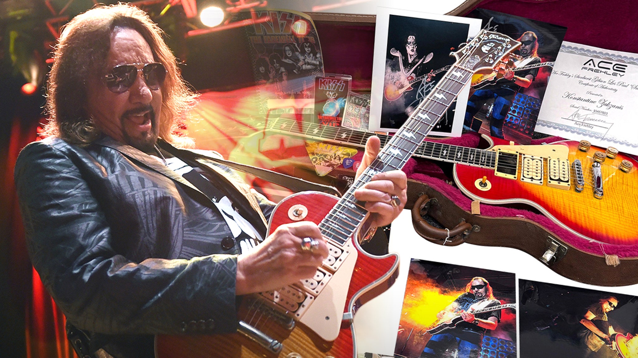 O lendário axman do Kiss possuía e autografava a guitarra Sunburst Gibson Les Paul Smoking, que é um dos vários instrumentos vendidos no leilão online apresentado por GottaHaveRockandRoll.com. A licitação começará na quarta-feira com um lance mínimo de US$ 100.000 por um pedaço da história do Ace.