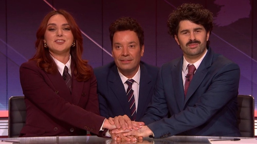 Depois que Magliano comentou: “Pode parecer que a Grã-Bretanha e os Estados Unidos se separaram. A relação especial está em apuros”, Fallon apareceu debaixo da mesa para colocar a mão nas dos anfitriões durante a sequência “Hand in Hand”. “Somos apenas dois apresentadores, sentados ao lado de um apresentador mais famoso, pedindo-lhe para aumentar a nossa audiência”, disse Young.