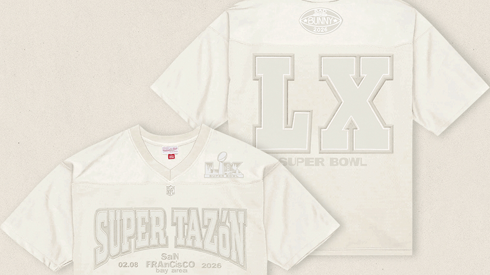 A frente da camisa branca creme diz “Super Tazon” (a tradução espanhola para Super Bowl), com LX Super Bowl impresso nas costas, sob o logotipo do futebol Bad Bunny. A marca de roupas esportivas lançará a camisa em quantidades limitadas, que já estão disponíveis para pré-encomenda no site da Mitchel & Ness. O produto será lançado oficialmente em 1º de maio.