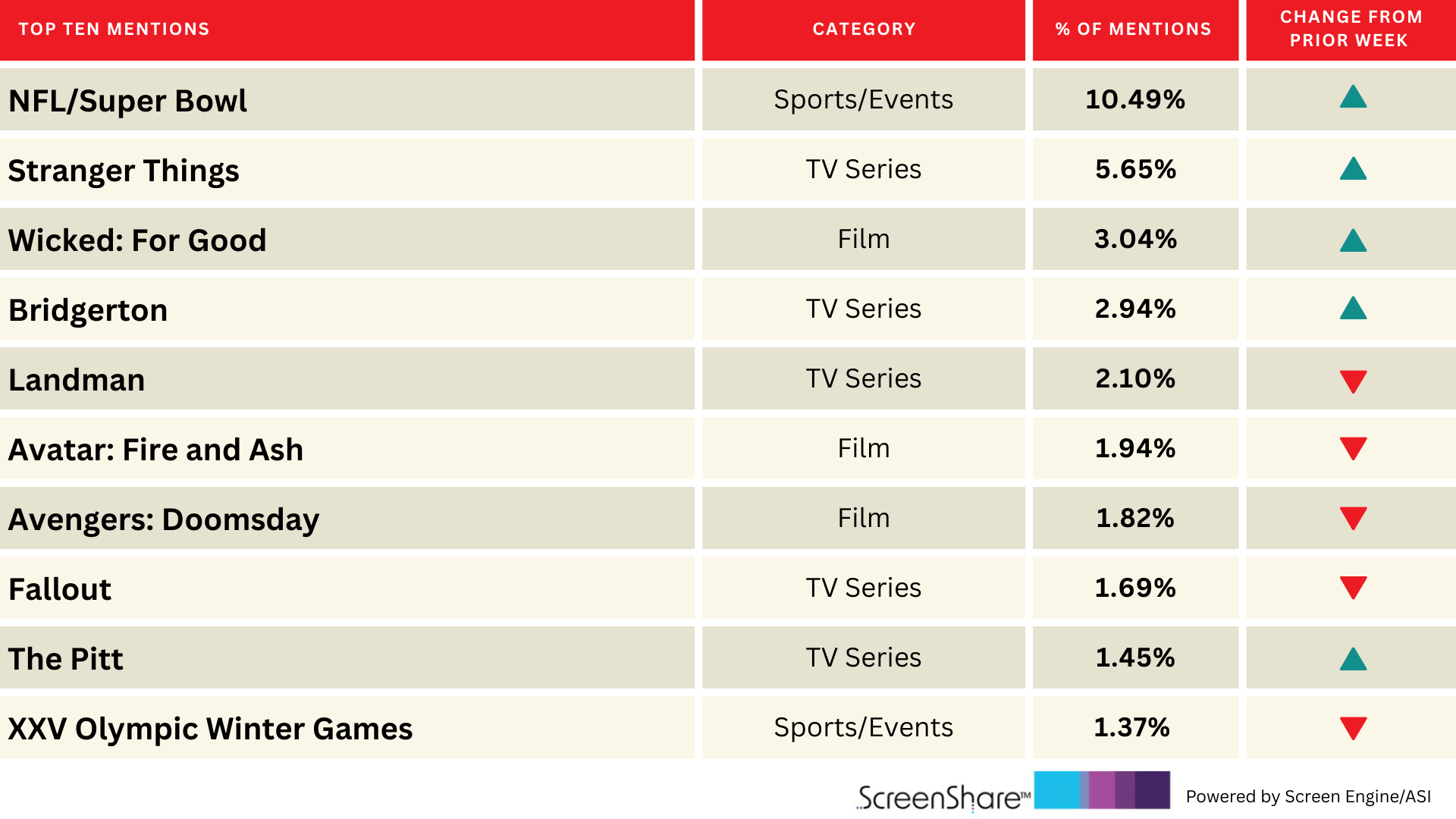 O interesse nas próximas opções de entretenimento para a semana de 24 a 30 de janeiro é liderado decisivamente pelo Super Bowl da NFL, que captura cerca de um décimo de todas as menções e registra um aumento semana após semana, reforçando seu papel como visualização dominante e de curto prazo. “Stranger Things” ocupa um distante segundo lugar, com ainda significativos 5,7%.
