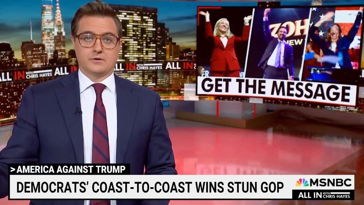 Hayes começou recapitulando o resultado das disputas para prefeito e governador desta semana na Virgínia, Nova York e Nova Jersey, onde os candidatos democratas, incluindo Zohran Mamdani, da cidade de Nova York, saíram vitoriosos. “Isso, honestamente, é apenas a ponta do iceberg, porque em todo o país foi apenas uma explosão total para os democratas”, disse Hayes. “Como uma noite do tipo 10 em 10.”