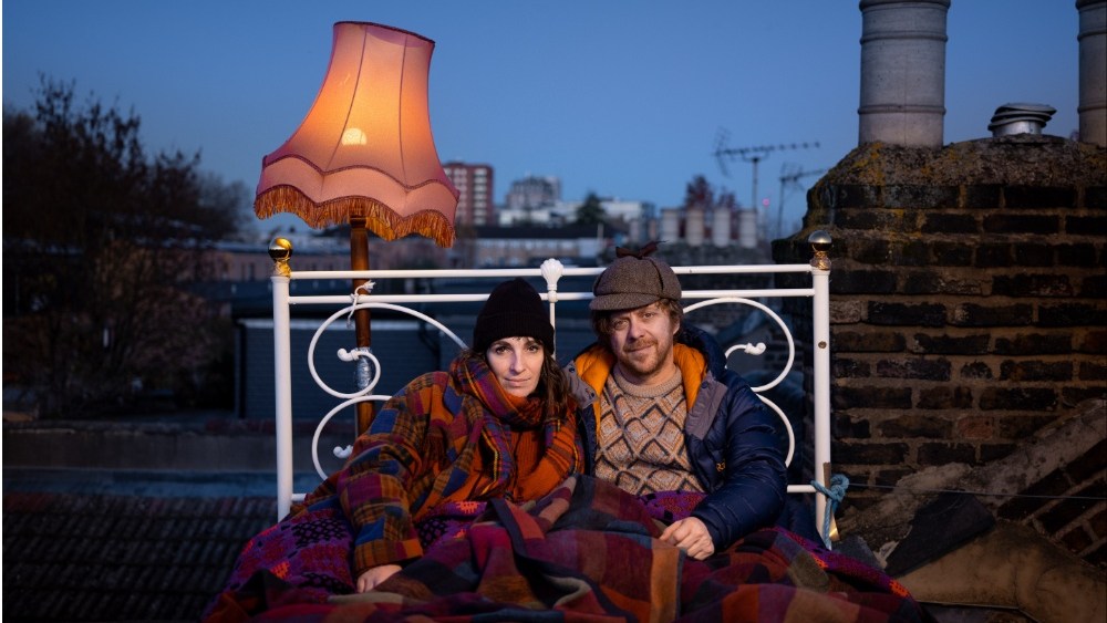 Corta para Lynmouth Road, Walthamstow, no nordeste de Londres: enquanto 39% da população do Reino Unido luta para aquecer suas casas, Edelstyn e Powell se amontoam sob cobertores, tentando em vão se aquecer com intermináveis ​​canecas de chá.
