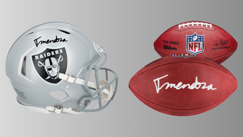 Fanatics tem este minicapacete autografado disponível por US$ 900 no momento em que este livro foi escrito. A réplica do capacete traz o autógrafo de Mendoza na lateral, logo acima do logotipo dos Raiders. Esta é uma peça de mercadoria de Mendoza oficialmente licenciada e o capacete vem com um holograma numerado individualmente e inviolável para certificar a autenticidade.