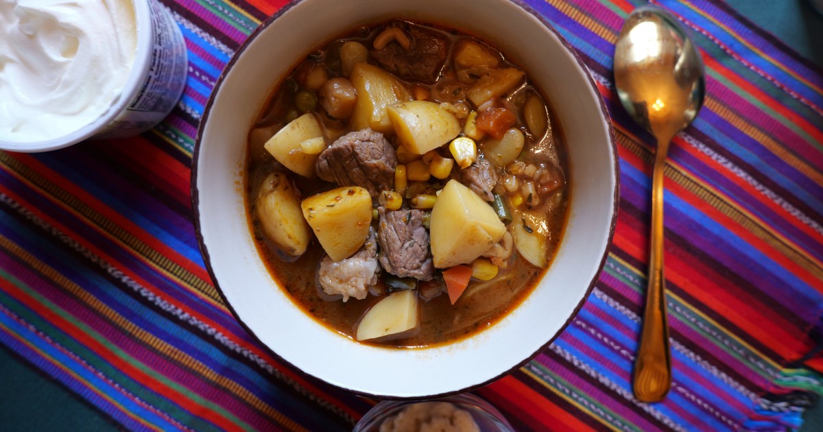 Combinado com temperos, cebola fatiada, batata amarela, vegetais e sopa condensada de vegetais Campbell’s, o ensopado rápido tem um toque delicioso com creme de leite e raiz-forte por cima.