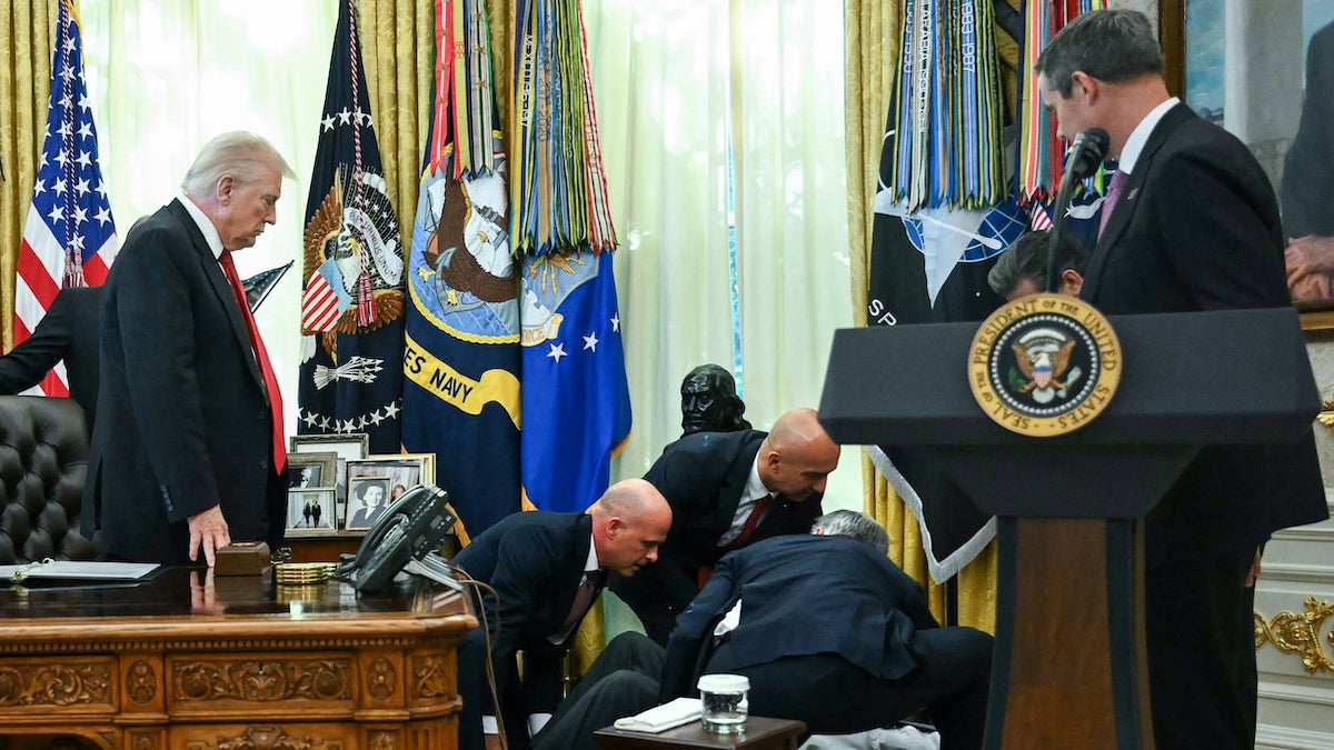 A mídia foi expulsa da sala depois que o homem caiu. Mehmet Oz podia ser visto virando-se para oferecer-lhe assistência, enquanto Trump parecia preocupado. Enquanto isso, o secretário de Saúde e Serviços Humanos, Robert F. Kennedy Jr., virou-se e caminhou na outra direção.