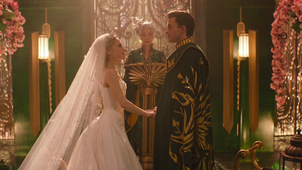 “Tínhamos filmado algumas cenas paralelas, mas não achei necessariamente que seria possível colocá-las em camadas umas sobre as outras”, diz Chu. “Além disso, a nota do estúdio foi: ‘Deixe o casamento acontecer. Você não tem muitos momentos de luz neste filme. Por que tornar escuro o único momento de luz?'”