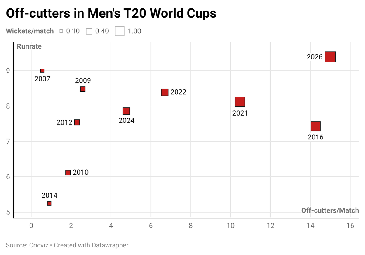 Houve 795 off-cutters na Copa do Mundo T20 de 2026, um salto significativo em relação ao recorde anterior em uma edição – 485 (2016).