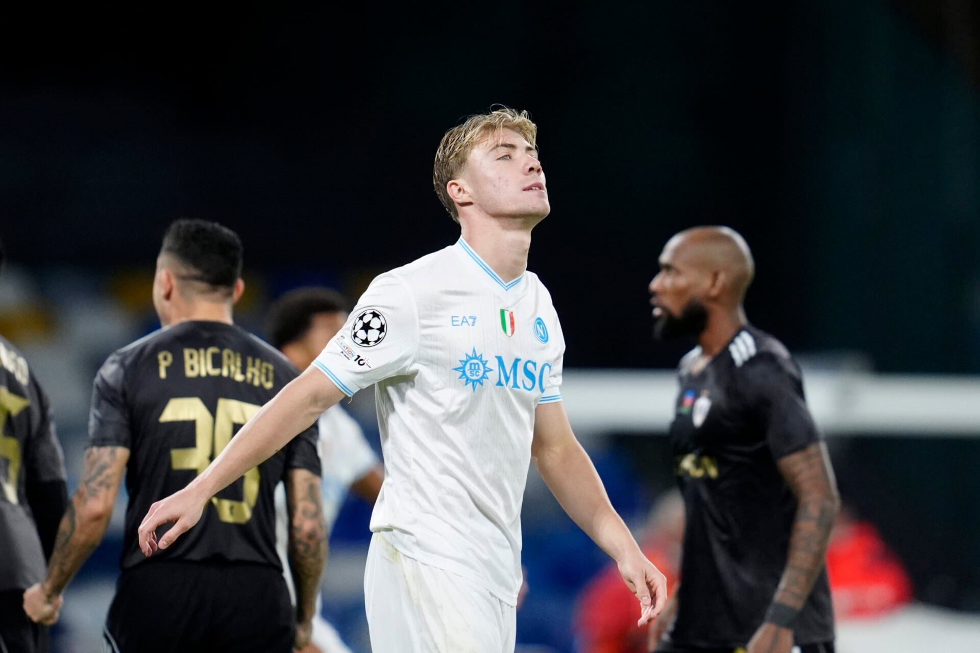 Rasmus Hojlund perdeu um pênalti na vitória do Napoli sobre o Qarabag FK na Liga dos Campeões, na noite de quarta-feira.
