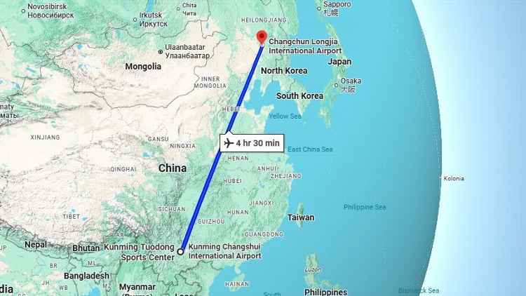As 1.819 milhas entre Yunnan Yukun e Changchun Yatai são bastante pequenas em comparação com o tamanho da China. Google Mapas