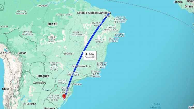 Enquanto a Série B da segunda divisão do Brasil tem um componente entre Amazonas (que fica na cidade de Manaus, na selva amazônica) e Criciúma, que envolve um grande salame de 3.810 milhas, que é ofuscado pelo videogame da Série A entre Fortaleza, na costa norte do Brasil, e Internacional, no sul do estado do Rio Grande do Sul, que vê os torcedores precisando fazer uma viagem de 3.990 milhas por todo o país para a celebração.