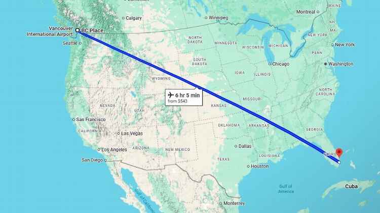 O Vancouver Whitecaps de Thomas Müller precisa fazer uma viagem de costa a costa para jogar contra o Inter Miami de Lionel Messi. Google Mapas