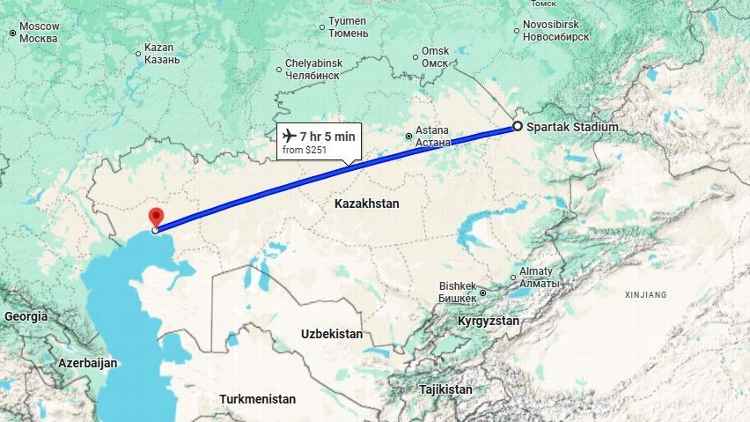 A principal viagem do Cazaquistão pode não ser uma das mais diferenciadas do futebol mundial, mas por ter sido organizada entre as 10 nações mais importantes do mundo por extensão territorial, o dia fora de casa entre o FC Yelimay e o FC Atyrau ainda consegue massagear os ombros com algumas das viagens mais longas do futebol profissional (2.606 milhas).