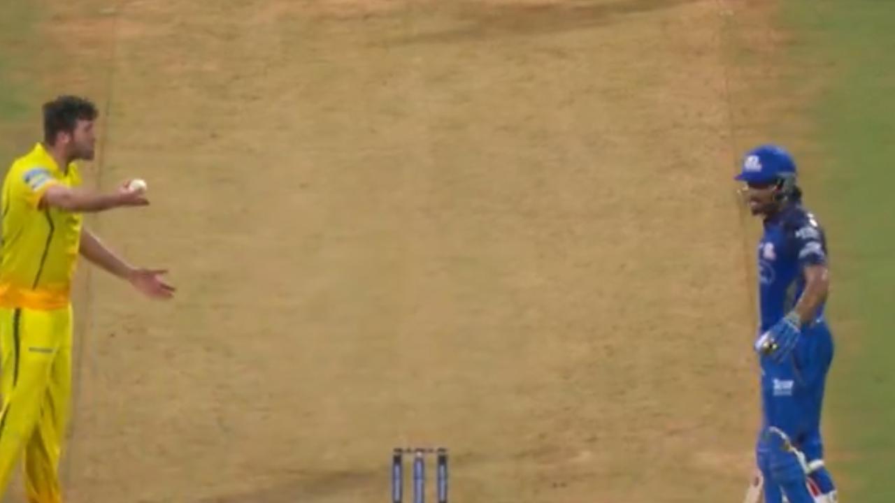 Durante a partida, o batedor estrela do MI, Tilak Varma, e Jamie Overton, do CSK, foram vistos tendo uma conversa acalorada.
