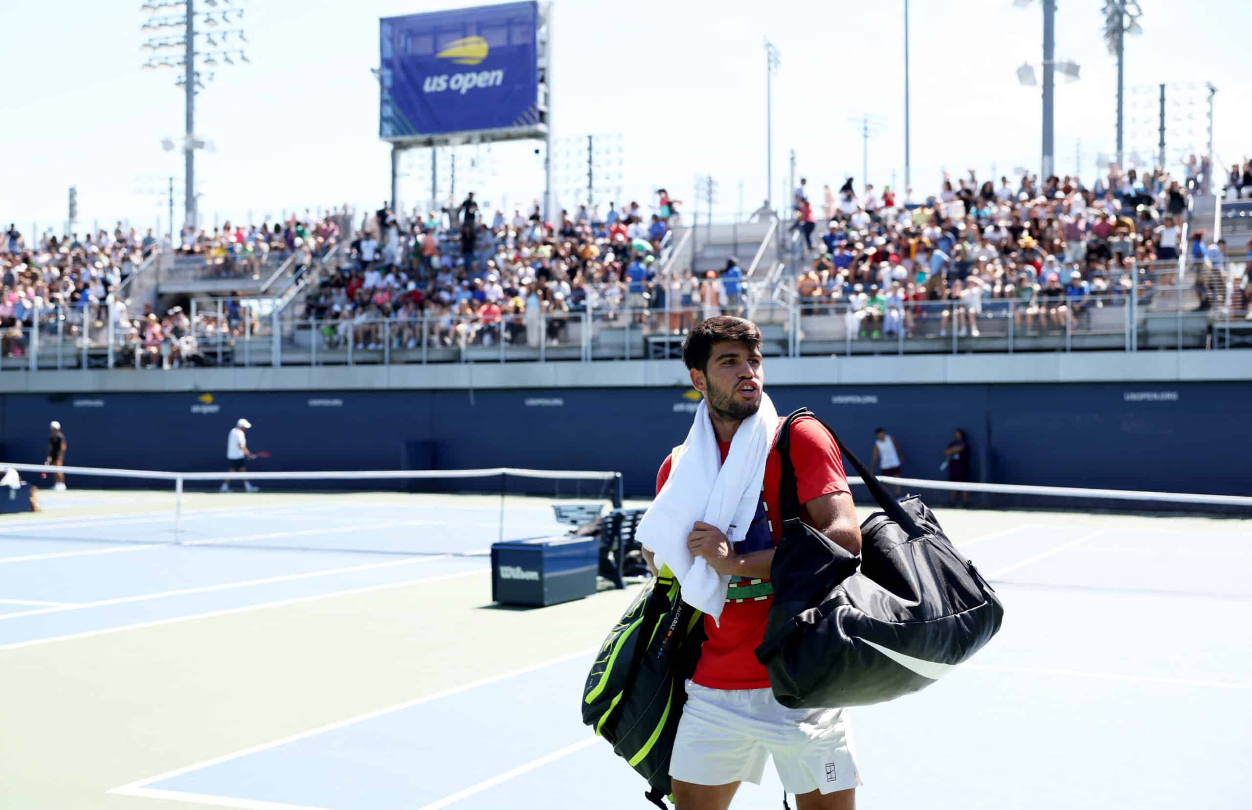 Carlos Alcaraz, da Espanha, sai da quadra depois de uma sessão de treinos antes do Aberto dos EUA no ITSA Billie Jean King National Tennis Center em 23 de agosto de 2025 na cidade de Nova York.