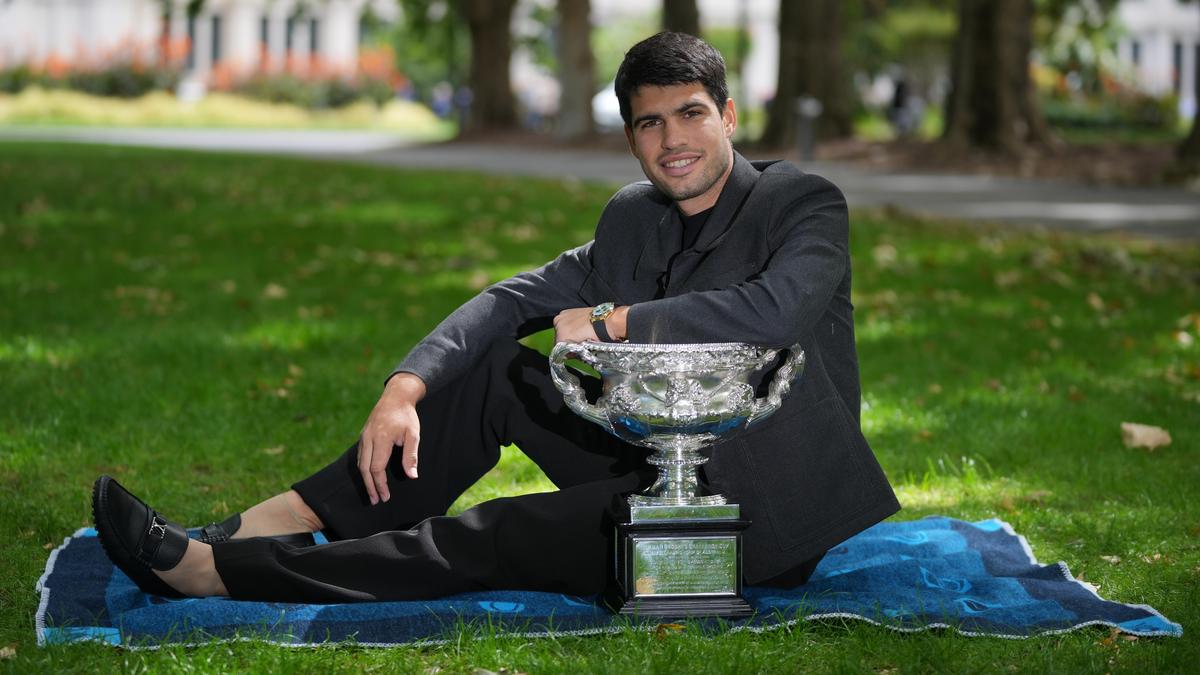 Alcaraz posou para os fotógrafos na segunda-feira com o troféu ornamentado do Aberto da Austrália, parecendo casualmente elegante em preto, mocassins e sem meias. A sessão de fotos aconteceu no Royal Exhibition Building, entre os jardins do centro de Melbourne.