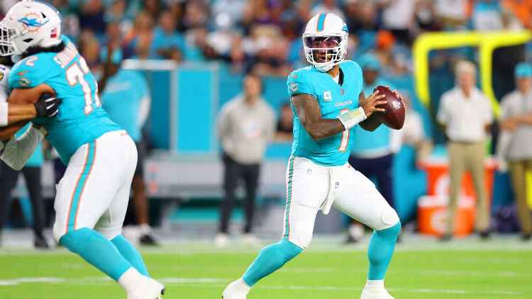 Sua conexão com o recebedor Jaylen Waddle pareceu nítida no primeiro tempo, e Tagovailoa mostrou uma química crescente com o tight end Greg Dulcich. Mas Miami lutou para esticar o campo fora de Waddle, e os Ravens mantiveram a bola na sua frente. Tagovailoa tirou a bola rapidamente, mas teve dificuldades quando sua primeira leitura não aconteceu. Nas tentativas de passe 2,5 segundos após o snap da bola, Tagovailoa completou 18 de 25 passes para 209 jardas; em tentativas que duraram mais de 2,5 segundos, ele completou apenas 7 de 14 passes para 52 jardas e uma interceptação com uma porcentagem de conclusão de -16,8% acima da expectativa.