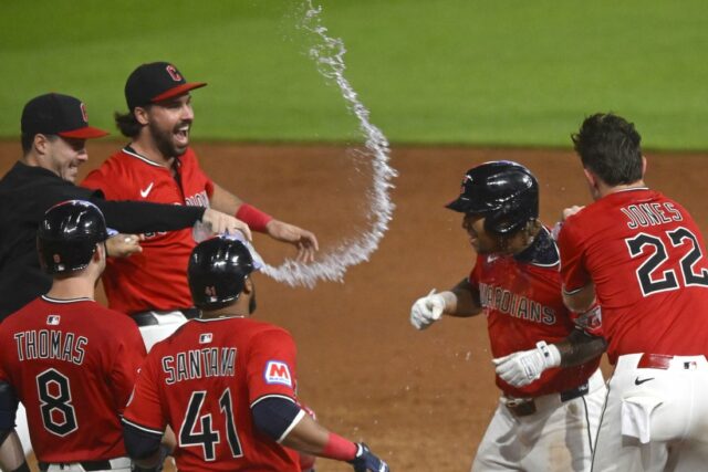 25 de junho de 2025; Cleveland, Ohio, EUA; Os Guardiões de Cleveland comemoram um jogo vencendo um jogo do terceiro Basman Jose Ramirez (direito a segundo) nas décimas entradas contra o Toronto Blue Jais na área progressiva. Crédito obrigatório: imagem de David Richard-Emagan