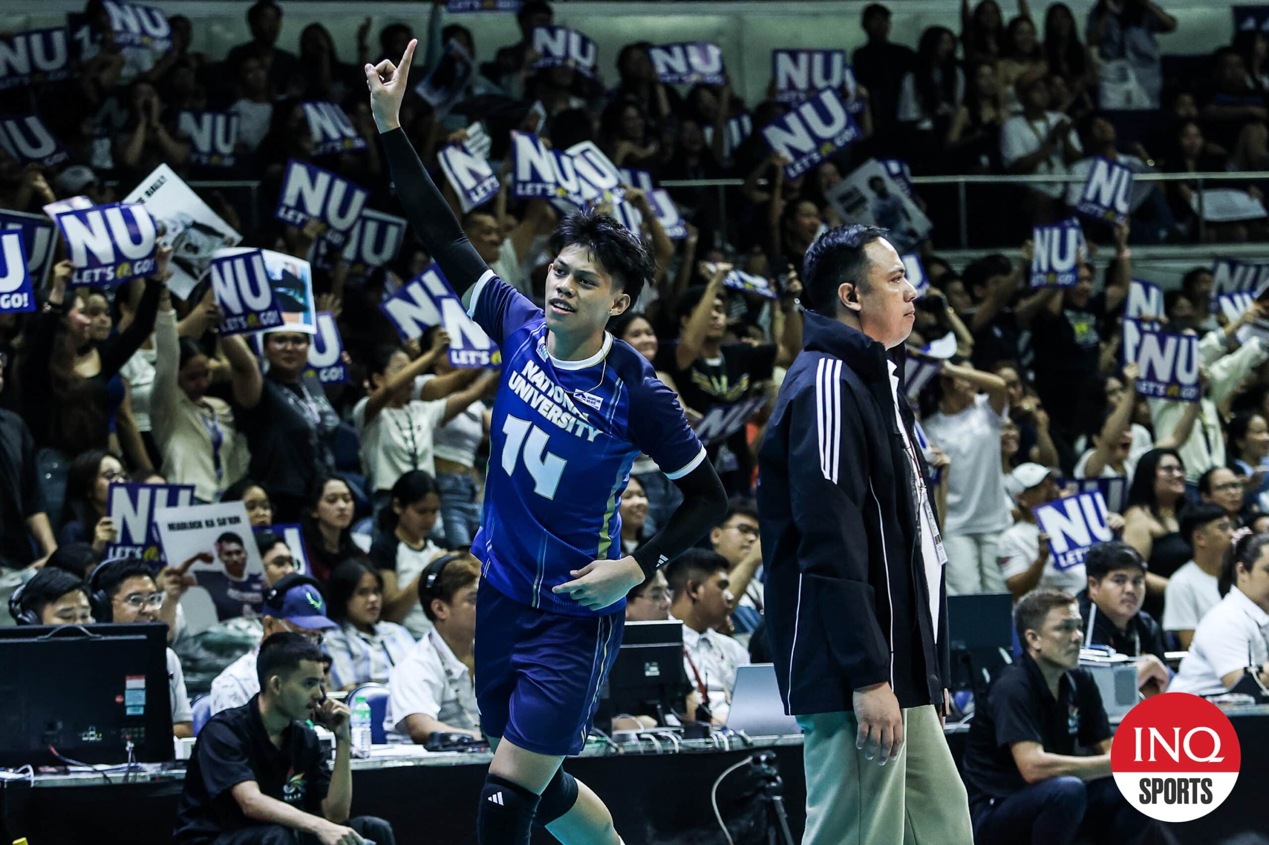 Leo ordiales gesticula durante a vitória dos quatro finais da NU sobre o UST no torneio de vôlei masculino da temporada 87 do UAAP.-Marlo Cueto/Inquirer.net