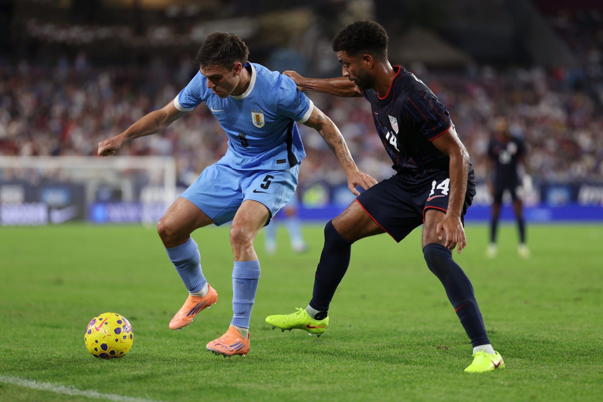 Sebastian Berhalter nº 17 dos Estados Unidos controla a bola sob pressão de Manuel Ugarte nº 5 do Uruguai durante o amistoso internacional entre Estados Unidos e Uruguai no Raymond James Stadium em 18 de novembro de 2025Foto de Kevin Sabitus/USSF/Getty Images