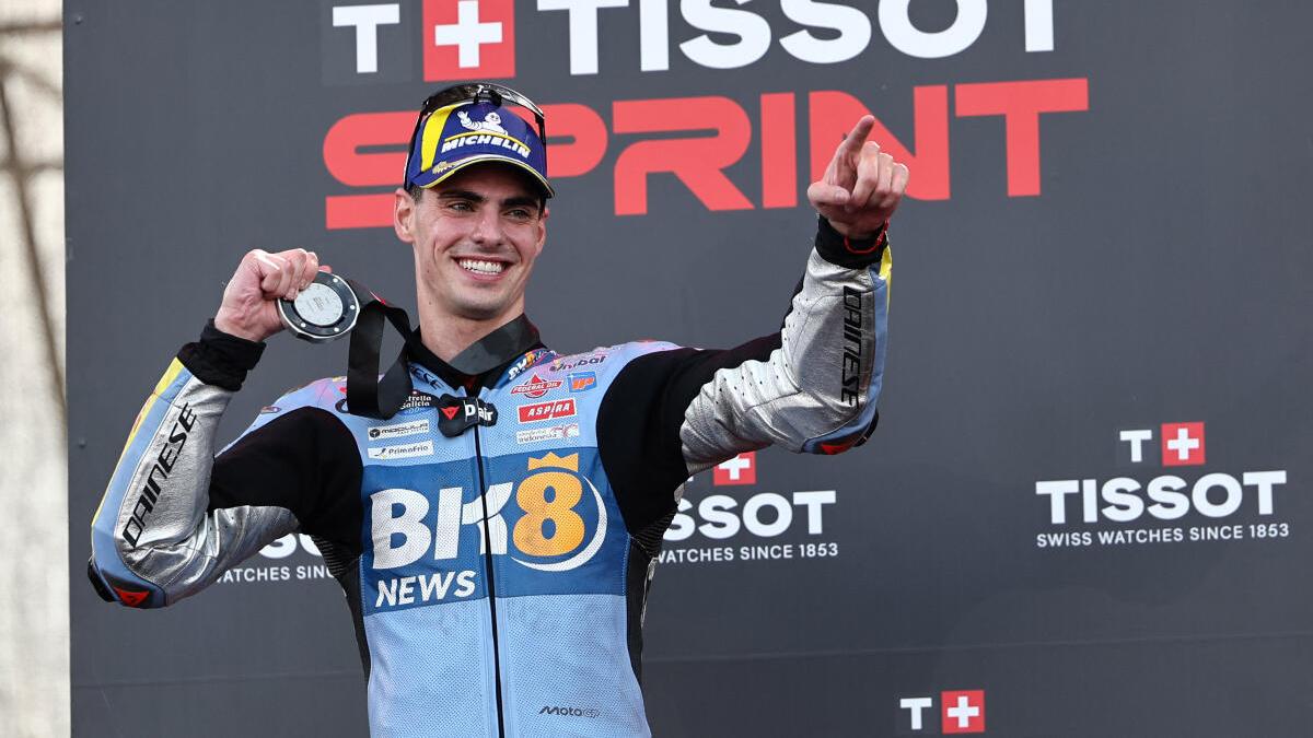O motociclista concorrente de Gresini, Aldeguer, que acabou em segundo lugar no Sprint no sábado, Rose Pedro Acosta, da KTM anterior, para assumir a liderança na 10ª volta, em algum momento completando quase 9 segundos livres dos concorrentes.