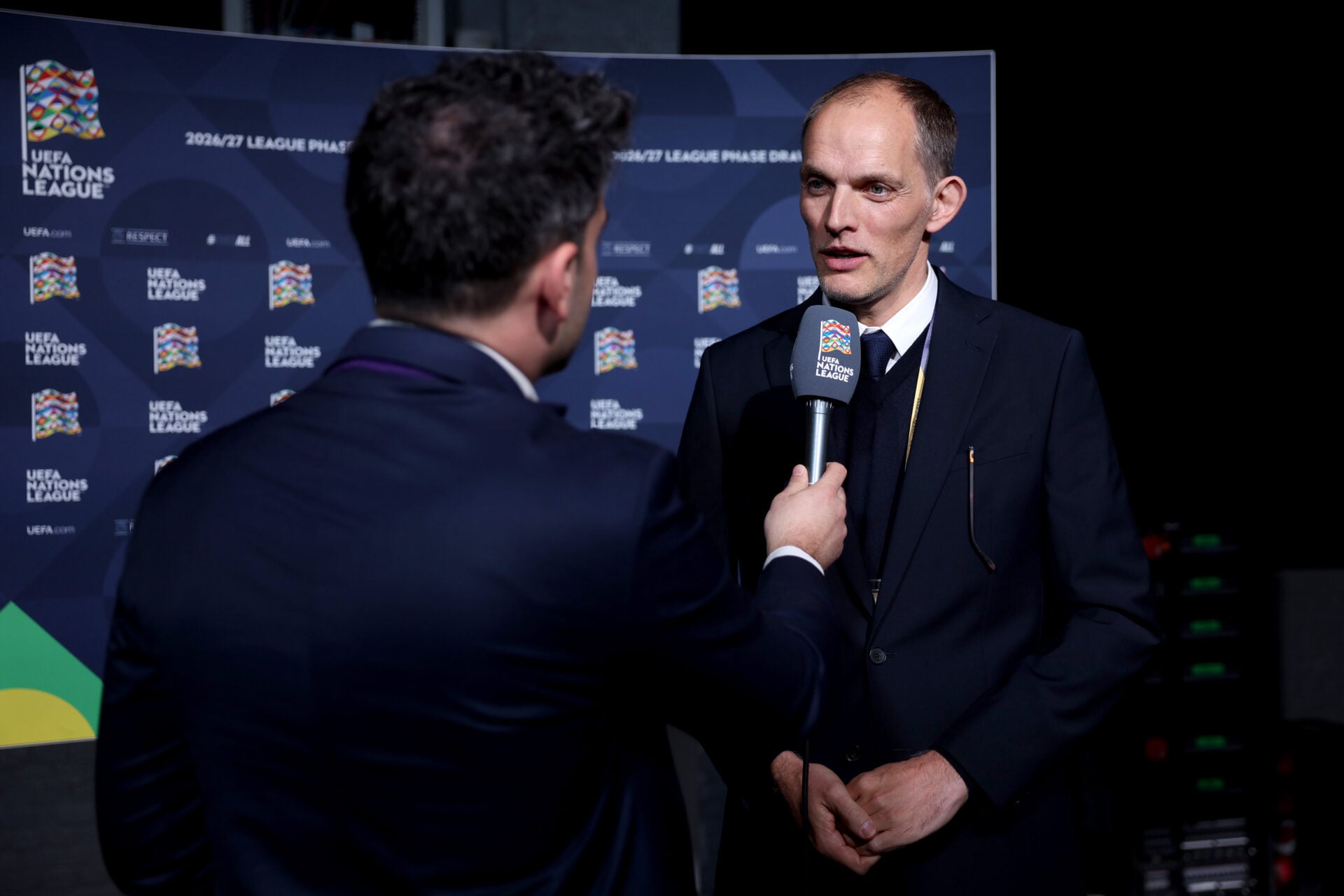 Thomas Tuchel é entrevistado após o sorteio da fase da liga 2026-28 da Liga das Nações da UEFA na Expo Bruxelas em 2026, em Bruxelas, Bélgica.Foto de Alex Bierens de Haan – UEFA/UEFA via Getty Images