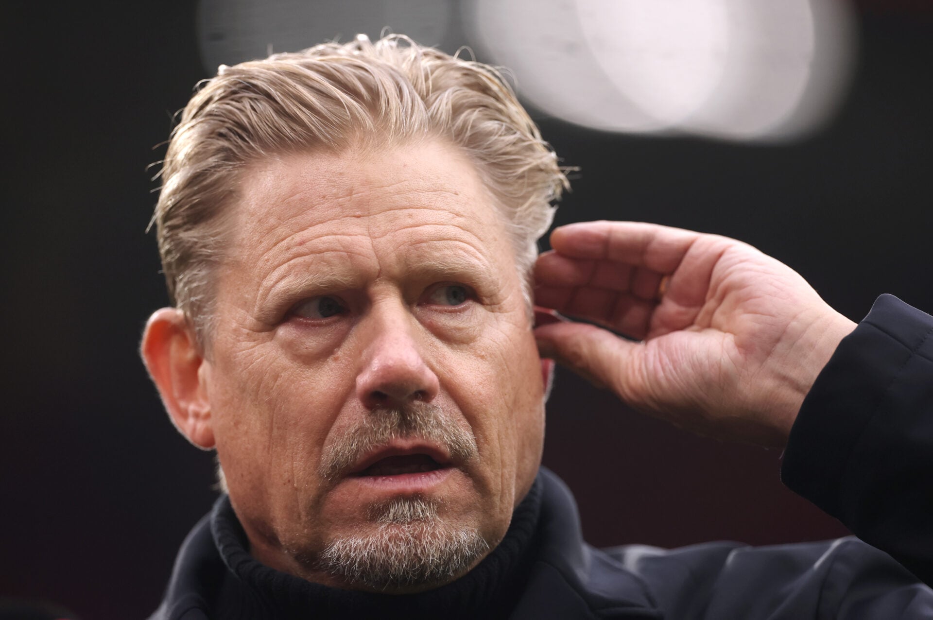 A lenda do Manchester United, Peter Schmeichel, durante a partida da Premier League entre Aston Villa e Manchester United no Villa Park em 2025 em Birmingham, Inglaterra.Foto de James Gill – Danehouse/Getty Images