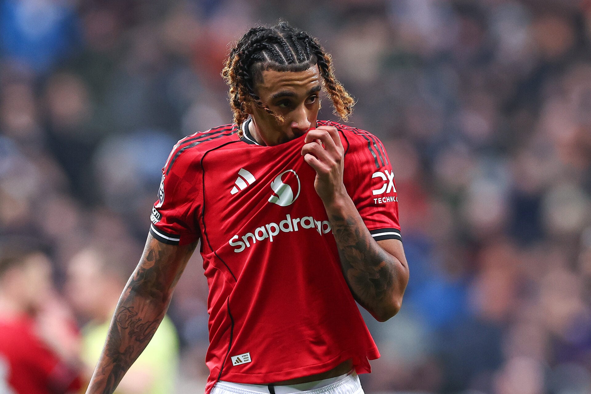 Leny Yoro observa durante a partida da Premier League entre Newcastle United e Manchester United no St James' Park em 2026 em Newcastle upon Tyne, Inglaterra.Foto de Ash Donelon/Manchester United via Getty Images