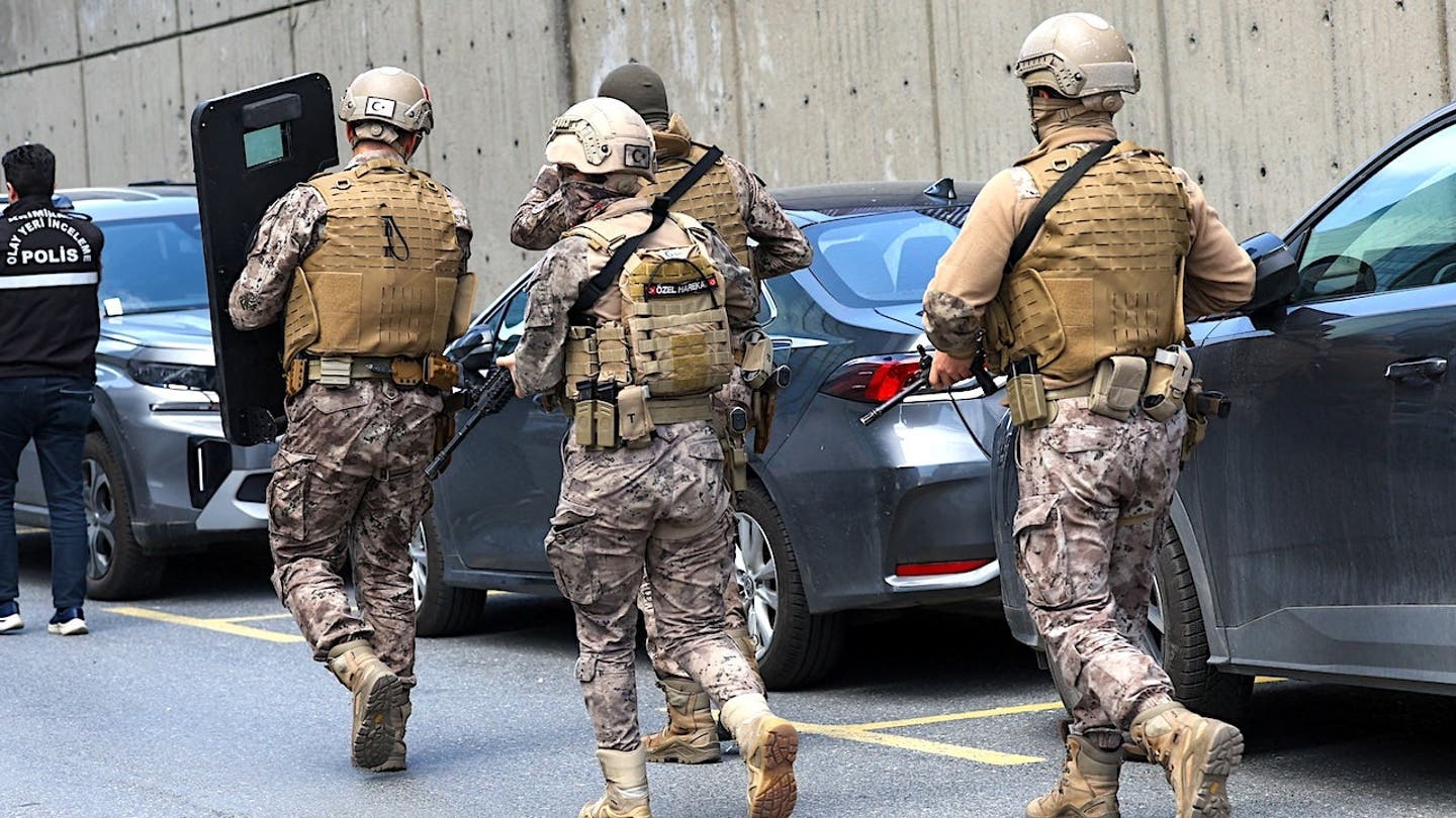 Forças especiais da Polícia Turca caminham perto do prédio que abriga o Consulado de Israel em Istambul, Turquia, após ouvir tiros em 7 de abril de 2026. (Murad Sezer/Reuters)