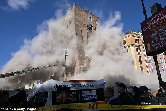 A poeira sobe depois que partes da torre Torre dei Conti desabaram, enquanto membros do serviço de emergência trabalham no local