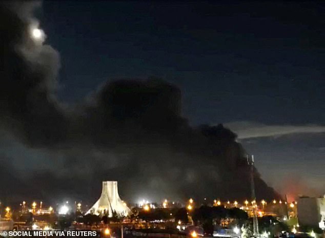 Fumaça e chamas subindo no local dos ataques aéreos a um depósito de petróleo em Teerã, em 7 de março