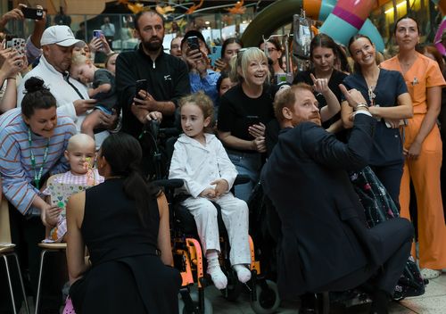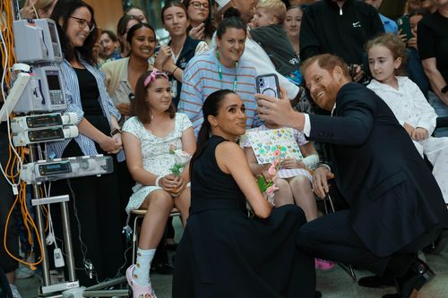 Durante a caminhada do casal pelo saguão do hospital infantil, Harry e Meghan dedicaram pelo menos 10 minutos conversando com pacientes jovens, distribuindo abraços calorosos e posando para fotos.