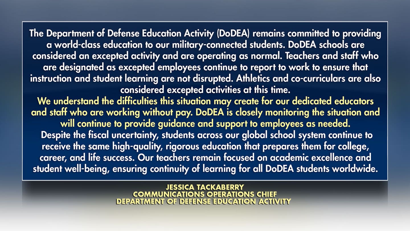 O Chefe de Operações de Comunicações da Atividade Educacional do Departamento de Defesa reconhece os desafios enfrentados pelos educadores e funcionários que trabalham sem remuneração durante a paralisação do governo.