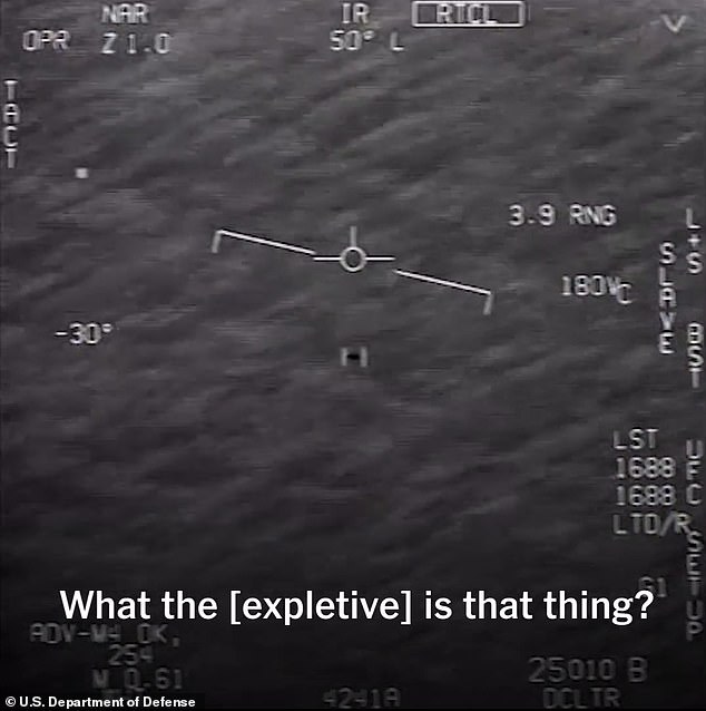 A filmagem granulada em preto e branco mostra um objeto voando baixo acima do Oceano Atlântico, capturado através do display de mira de um caça a jato enquanto um piloto pode ser ouvido exclamando: ‘Ohhh, entendi!’