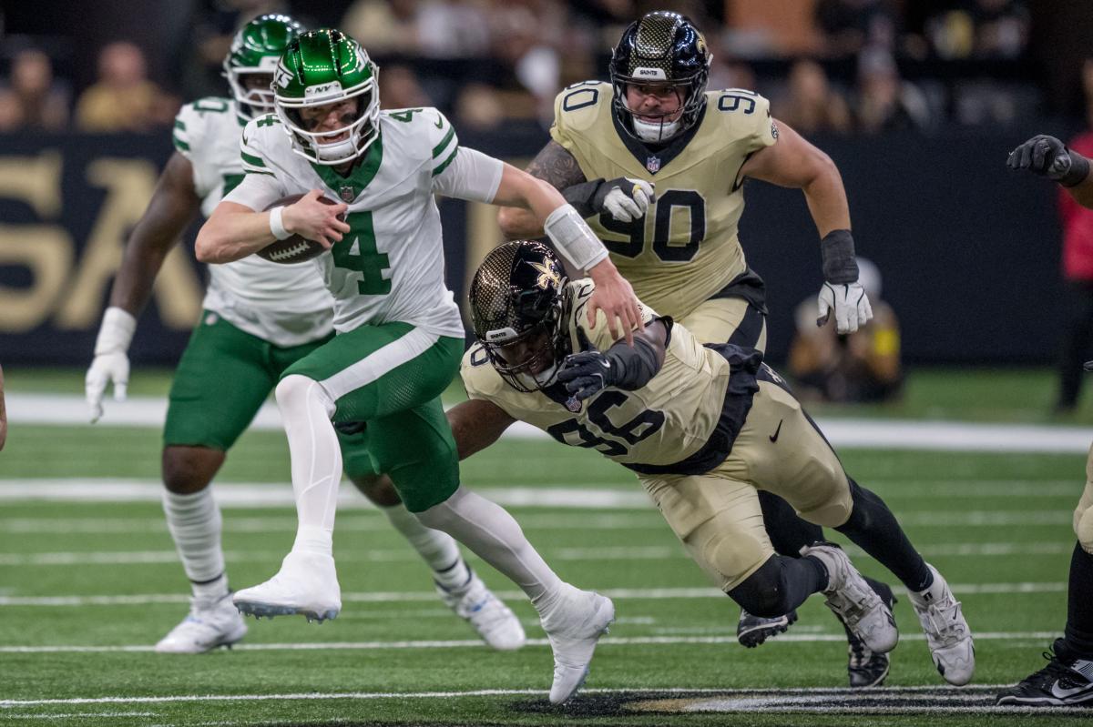 O quarterback do Jets, Brady Cook (4), enfrenta o lado defensivo do New Orleans Saints, Carl Granderson (96), durante o primeiro tempo no Caesars Superdome. IMAGENS IMAGN via Reuters Connect
