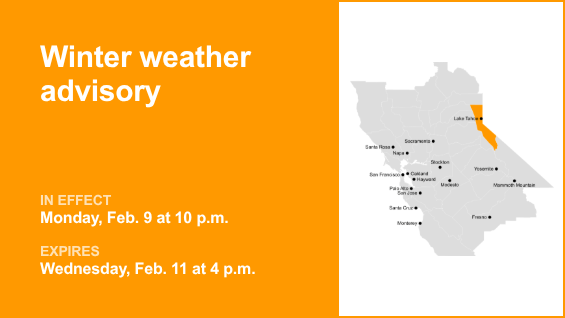 O Serviço Meteorológico Nacional divulgou um aviso meteorológico de inverno às 11h44 de domingo, válido de segunda-feira, às 22h, até quarta-feira, 11 de fevereiro, às 16h, para a área do Grande Lago Tahoe.