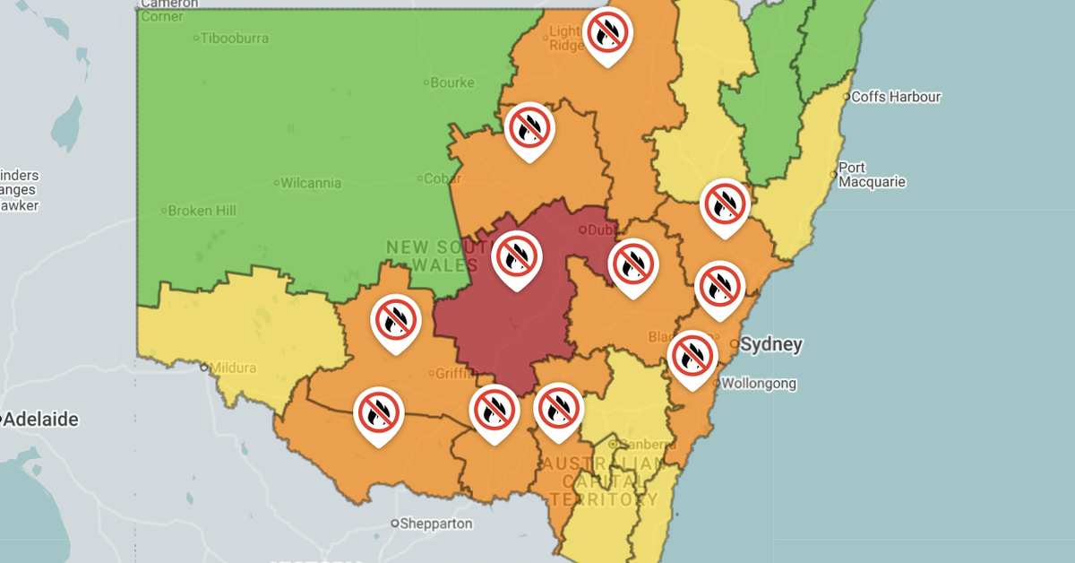 Isso inclui Greater Hunter, Greater Sydney, Illawarra, Shoalhaven, Central Ranges, North Western, Upper Central West Plains, Southern Slopes, Eastern Riverina, Southern Riverina e Northern Riverina.