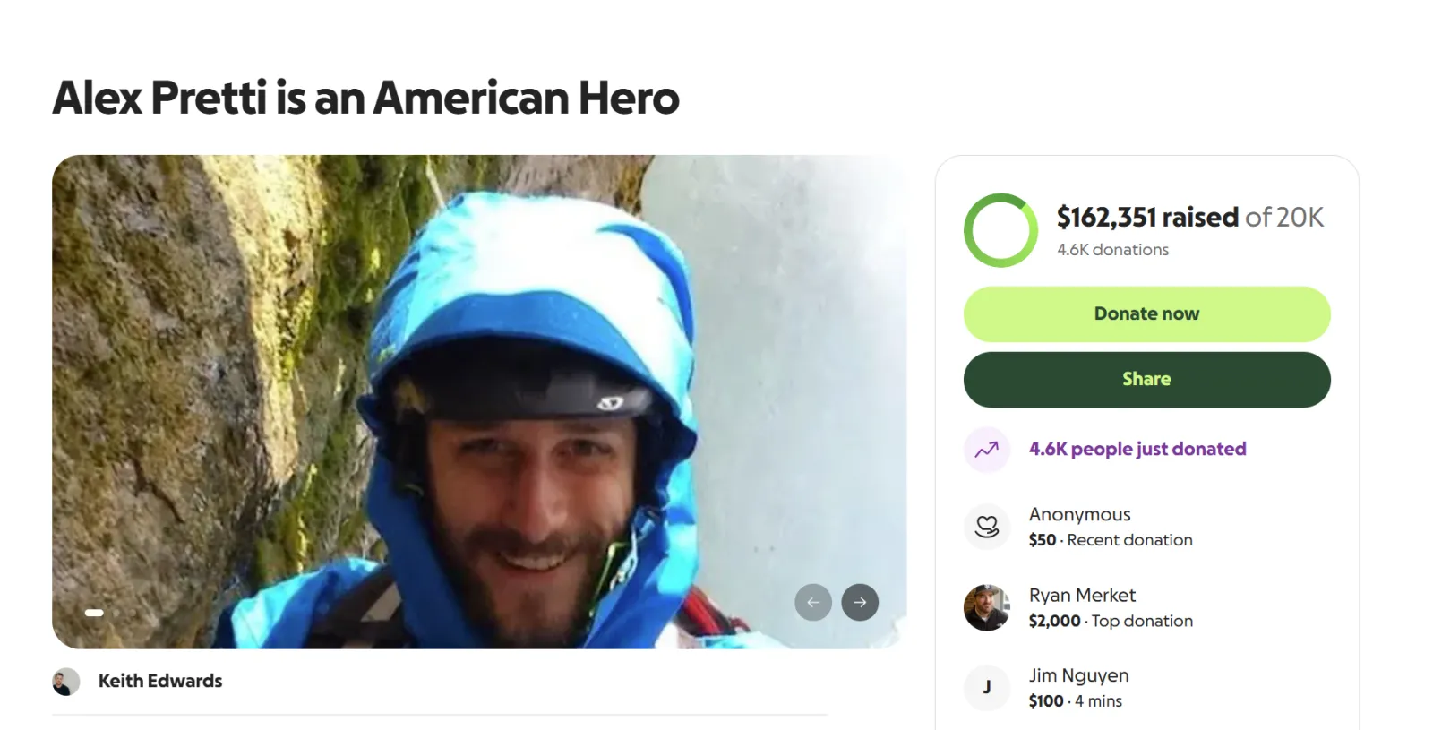 Uma campanha GoFundMe intitulada “Alex Pretti é um herói americano” arrecadou mais de US$ 160.000 de milhares de doações na noite de sábado, excedendo em muito sua meta inicial de US$ 20.000. Keith Edwards organizou a arrecadação de fundos após o assassinato fatal de Alex Jeffrey Pretti por agentes da Patrulha de Fronteira durante uma operação federal de fiscalização da imigração em Minneapolis.