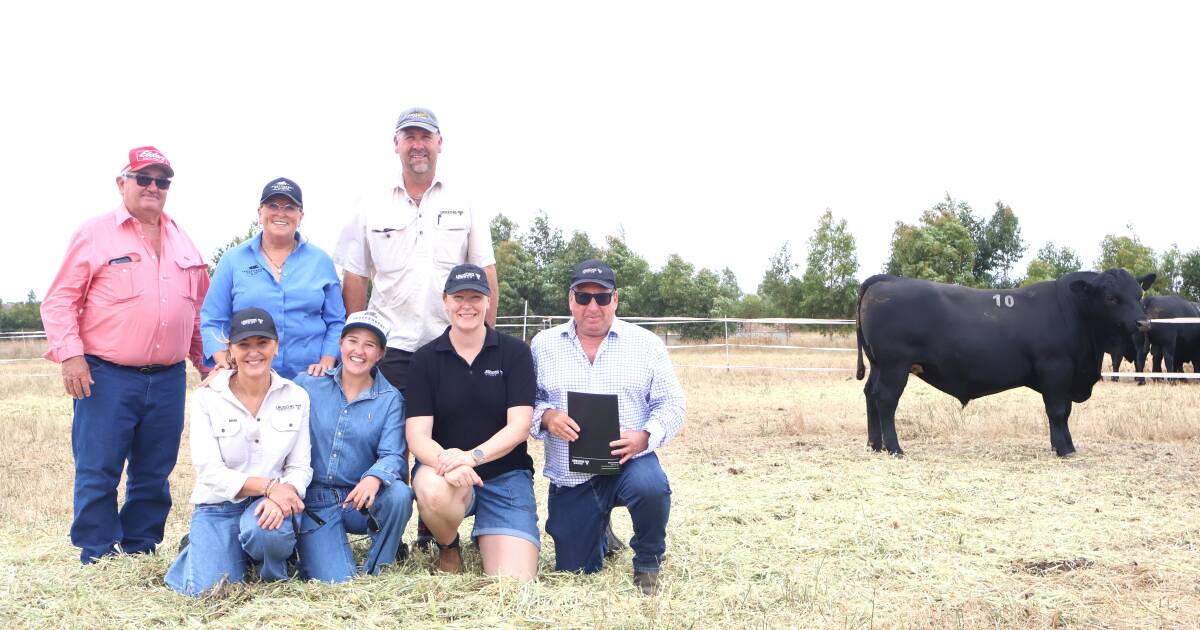 Com o touro mais caro de $ 40.000 do lote 10, Lawsons Apex V848 (AI), que foi vendido para a família Thexton, Blue River Grazing, Northcliffe, estavam o gerente de gado de Elders Albany, Wayne Mitchell (à esquerda), Kerry Thexton, Independent Rural Agents (IRA), Pemberton, Bevan Ravenhill, co-operador de Lawsons Angus WA, Ruth e Charlotte Lawson (canto inferior esquerdo), Lawsons Angus, Lawsons Angus WA a cooperadora Rebecca Ravenhill e o diretor do garanhão Lawsons Angus, Harry Lawson. Foto de Kyah Peeti.
