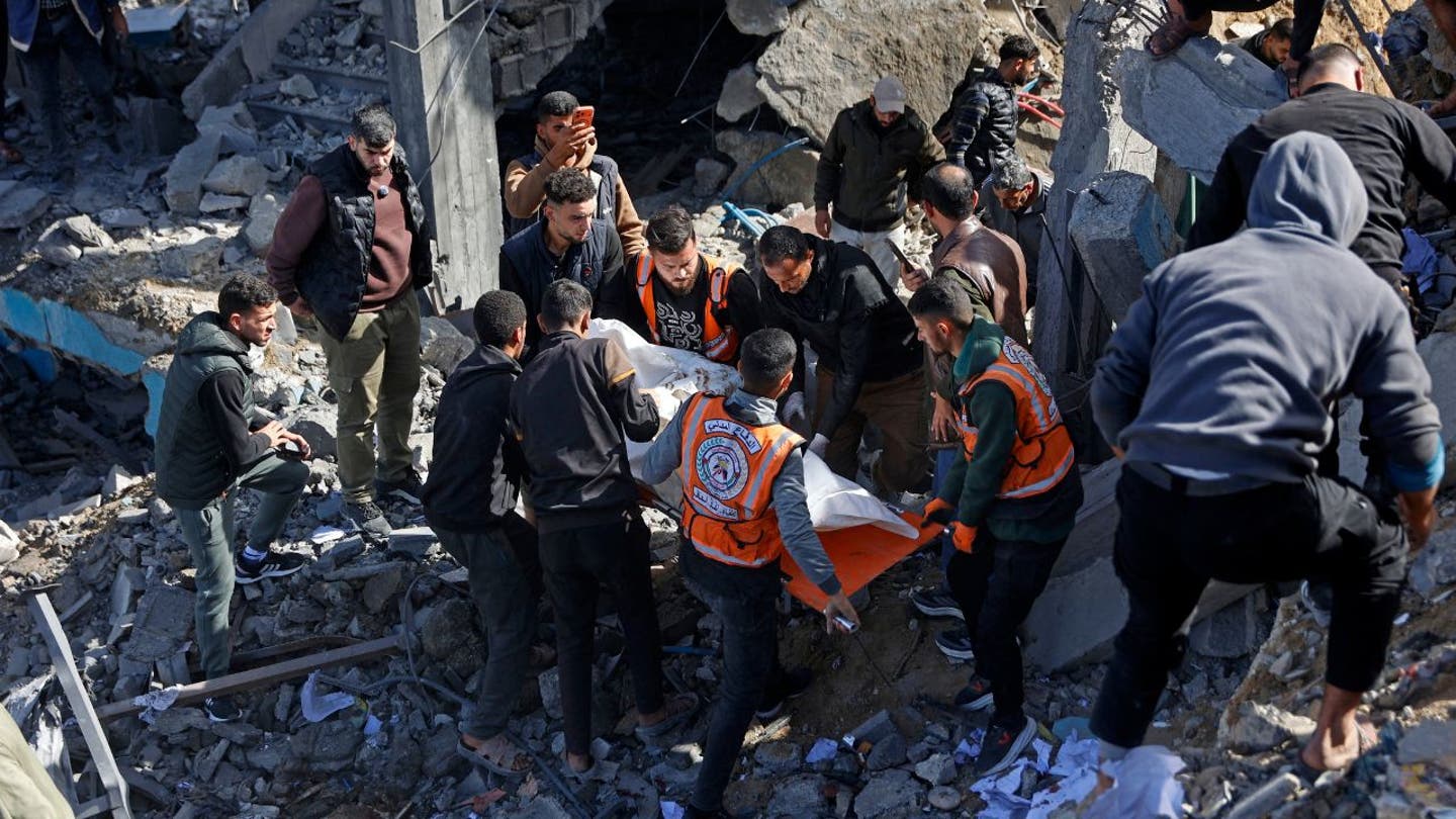 Equipes de resgate carregam o corpo de uma vítima em meio aos escombros após um ataque aéreo israelense a uma delegacia de polícia na cidade de Gaza em 31 de janeiro de 2026, de acordo com o Ministério da Saúde administrado pelo Hamas em Gaza. (Omar Al-Qattaa/AFP via Getty Images)