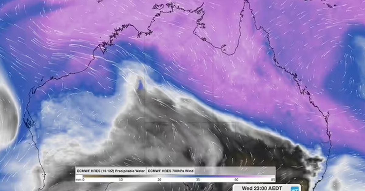 Previsão de água precipitável e vento de 700 hPa às 23h AEDT na quarta-feira, 24 de dezembro de 2025. (Zona climática)Espera-se que chegue na parte de trás de um onda de calor em muitas partes do país esta semana.