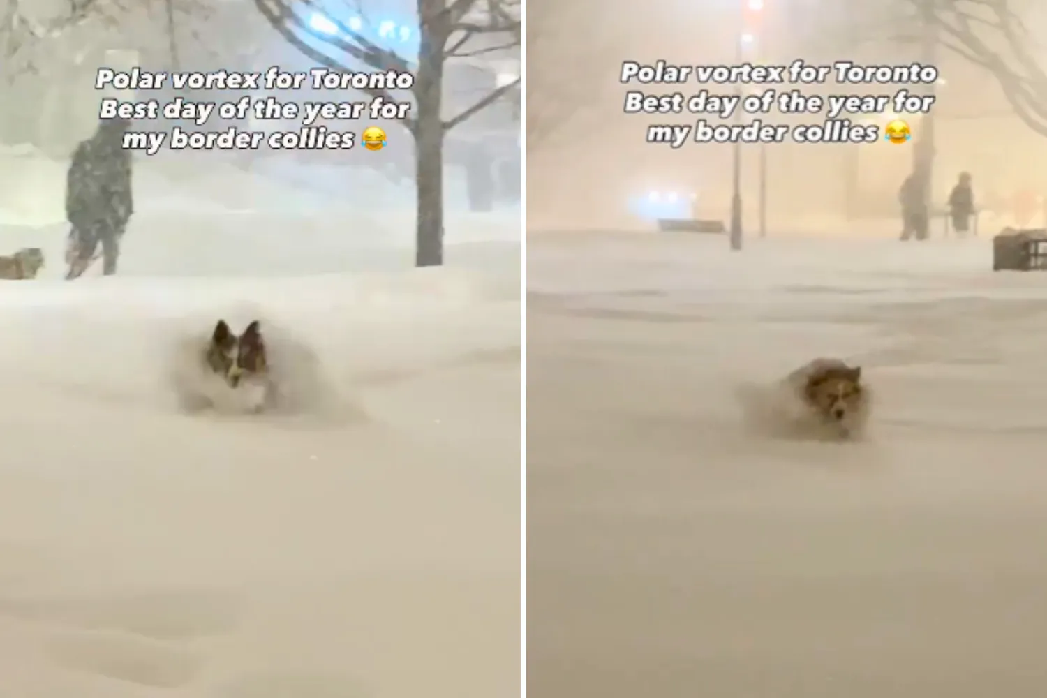 Mais ao norte, em Toronto, onde alguns bairros viram quase 23 centímetros de neve em meio a condições de vórtice polar neste fim de semana. Mas os border collies Everest, 7, e Bali, 3, estavam vivendo suas melhores vidas. Num vídeo partilhado pelos seus donos, os cães foram capturados saltando sem esforço através da neve profunda e pulverulenta num parque local, aparentemente imperturbáveis pela tempestade. Um clipe, com a legenda “Vórtice polar para Toronto. Melhor dia do ano para meus border collies”, acumulou mais de 250.000 visualizações no Instagram.