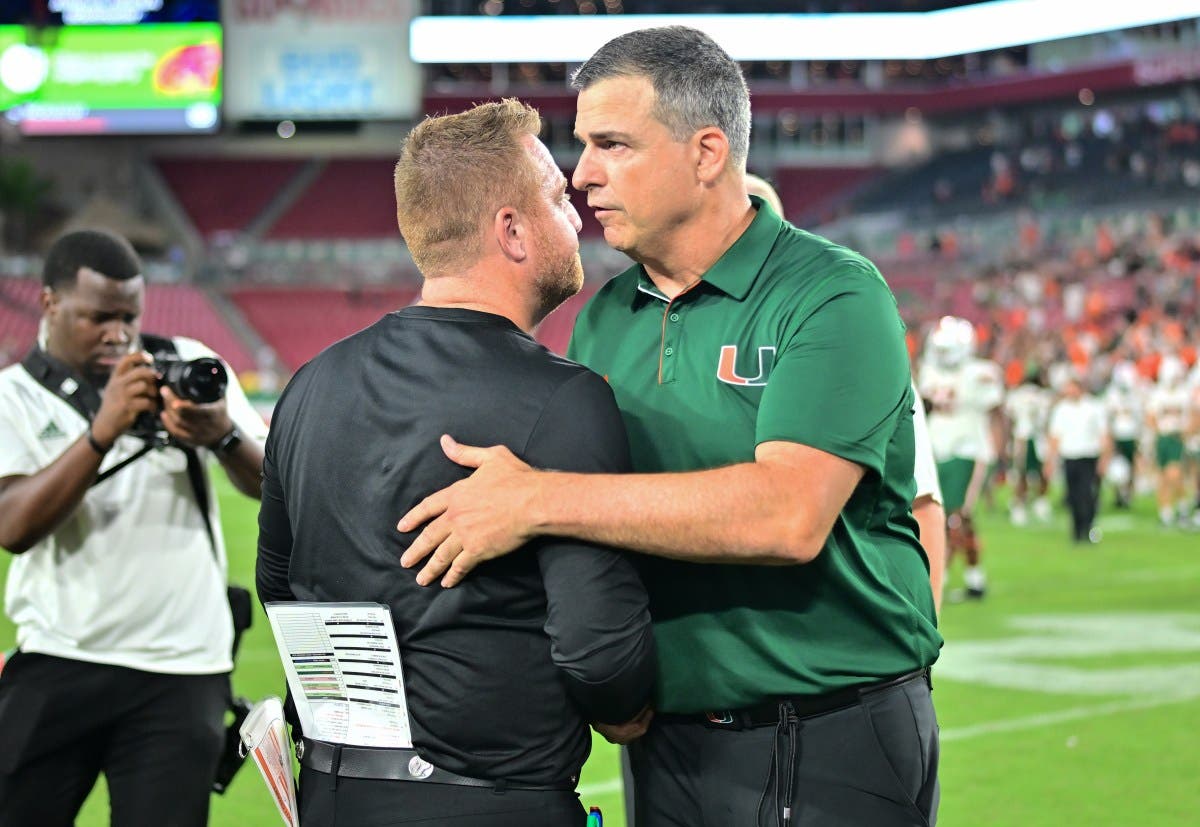 College football head coach Mario Cristobal of the Miami Hurricanes shakes hands with head coach Alex Golesh
