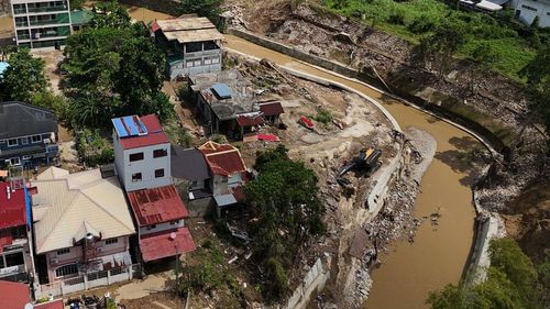 Casas danificadas ao longo de um rio em Bacayan, província de Cebu, centro das Filipinas, depois que o tufão Kalmaegi devastou a província. (AP)
