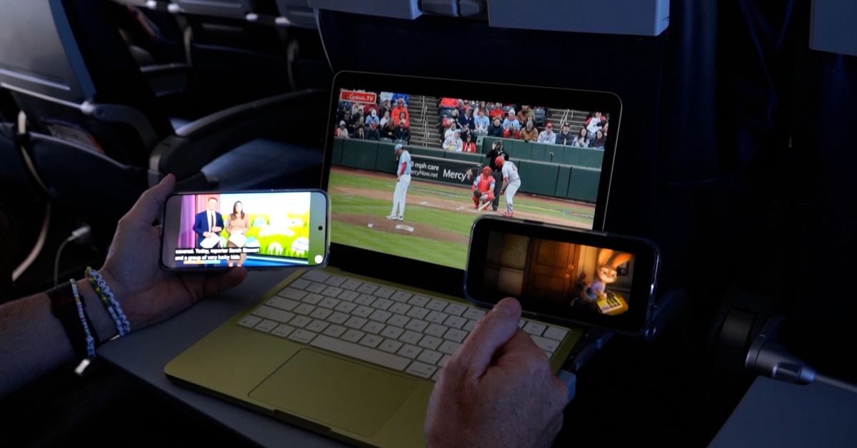 Testei o serviço Starlink da United ontem como convidado em um voo somente de mídia pela Califórnia e consegui usar vários dispositivos para transmitir esportes ao vivo, assistir ao YouTube e até mesmo acessar ofertas de filmes da United durante o voo em meu próprio dispositivo.