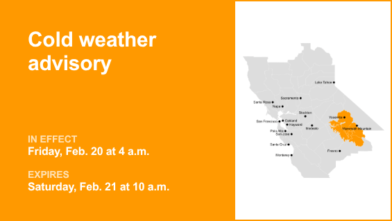 Yosemite está incluído em um aviso de clima frio emitido pelo Serviço Meteorológico Nacional na quinta-feira às 4h14. O aviso é válido de sexta-feira, 4h, até sábado, 21 de fevereiro, às 10h.