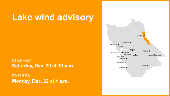 No sábado, à 1h31, o Serviço Meteorológico Nacional divulgou um aviso de vento lacustre válido das 22h até segunda-feira, 22 de dezembro, às 4h, para a área do Grande Lago Tahoe.