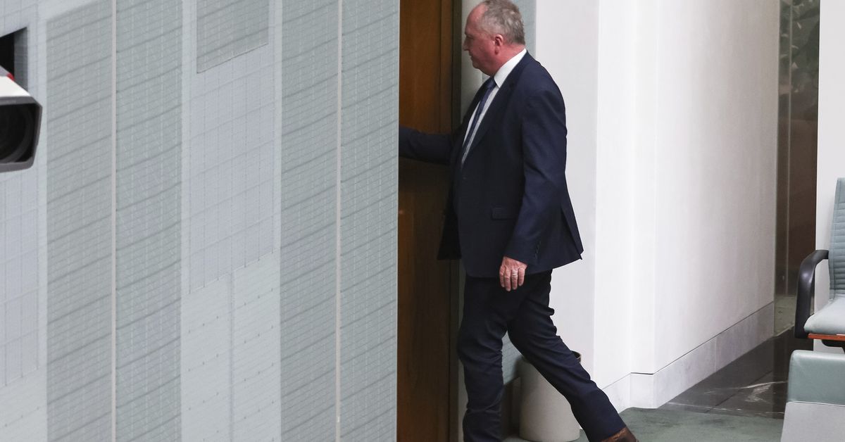 O membro da Nova Inglaterra Barnaby Joyce sai da câmara depois de fazer uma declaração de 90 segundos na Câmara dos Representantes no Parlamento em Canberra na quinta-feira, 27 de novembro de 2025. (Alex Ellinghausen)